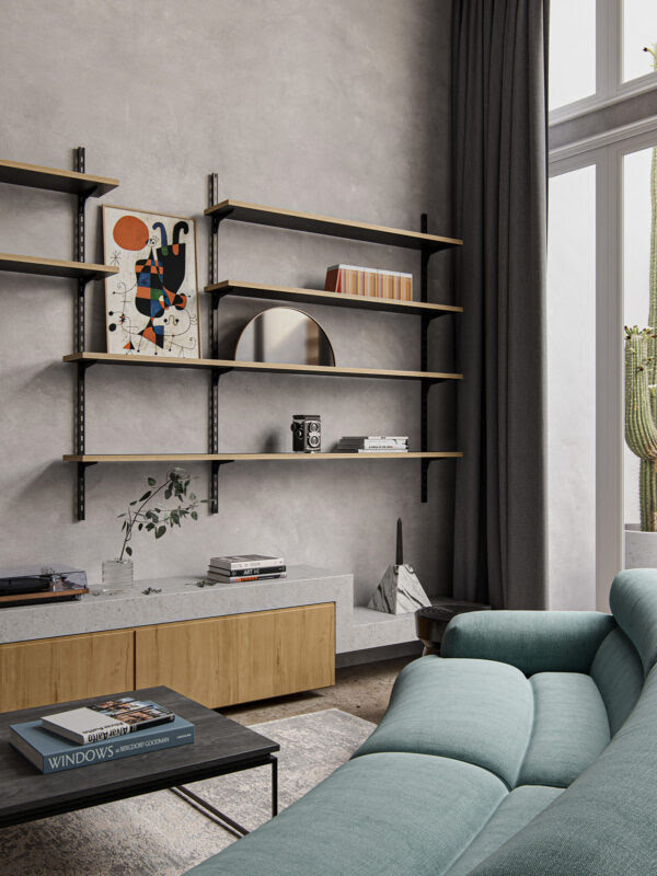 The room has a simple geometry. A low bench trims the base of a projection wall, a stack of display shelves cut into the corner, and roller blinds complete the wraparound linearity.