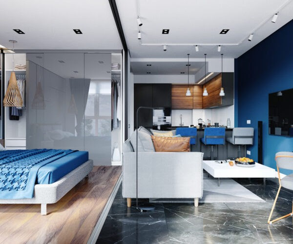 These chilled interior designs come along with warm accents to build spaces that feel welcoming and homey. Rattan pendant shades, natural timber elements and floors, and even some splashes of gold and red turn up the heat. A scattering of indoor plants add another beat of colour to the palette, and paint a picture of a more lived in, more loved place. Modern furniture silhouettes and stylish light choices come together in bold and confident arrangements that make the most of the compact quarters they are assigned to.Designer: KM Design Lab Visualizer: KM Design Lab
