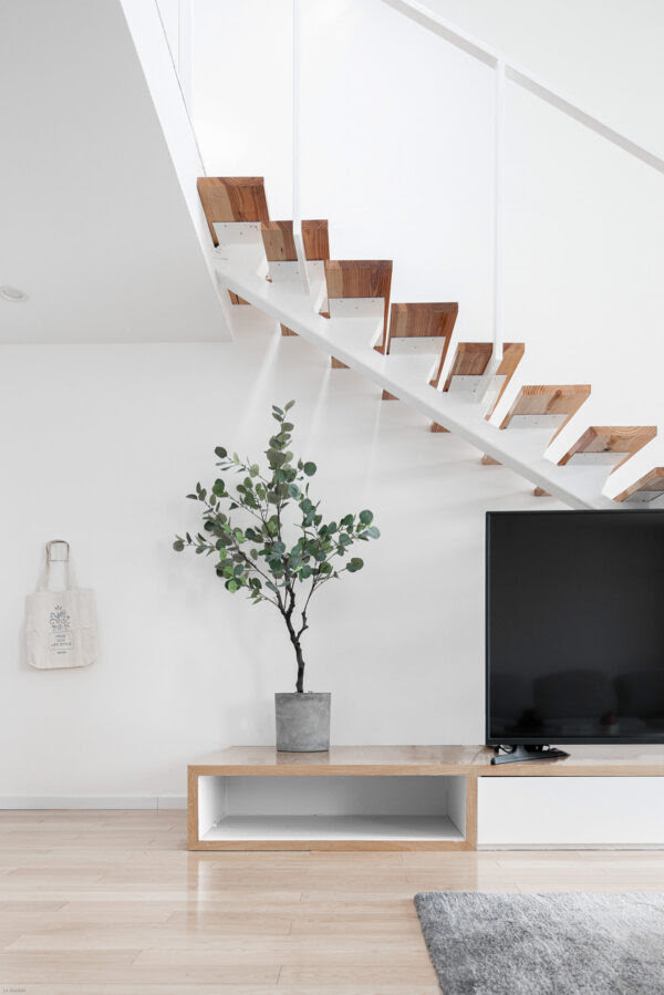 Our second home tour takes place in the 96 square metre Half Space Residence, located in Wen Ling, Zhe Jiang Province, China. In this minimalist living space, the spine of an open staircase design stretches up across the focal TV wall. A sleek low level modern TV stand extends a matching wood and white finish beneath the treads.